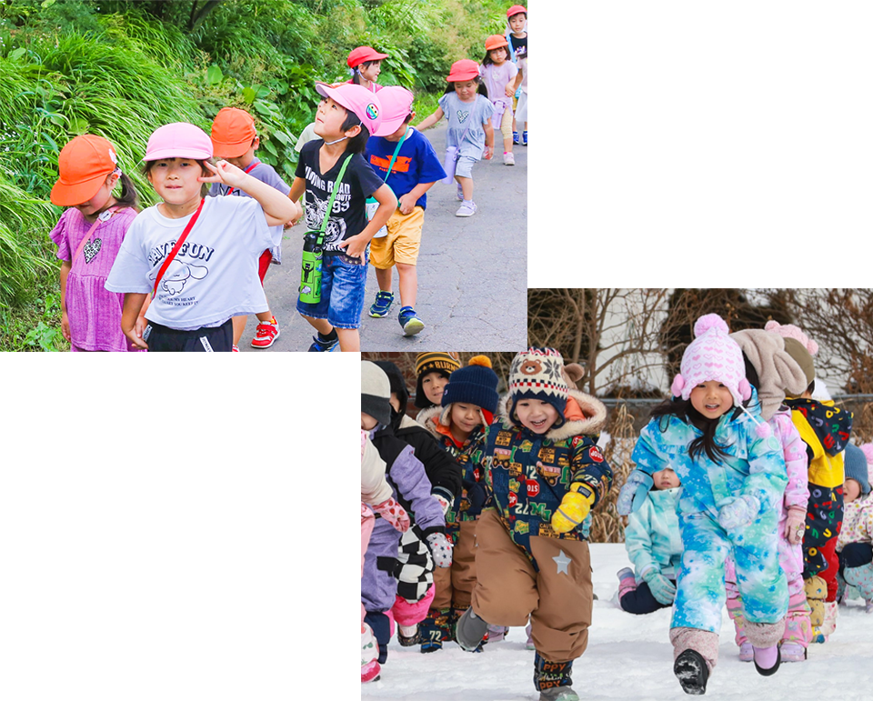 歩く(走る)ことはシンプルですが身体の成長で何よりも重要なこと。毎日の積み重ねで自然と筋力が育ち、丈夫で健康な身体が作られます。当園では幼児期からお散歩をたくさん経験して、歩くことの大切さを感じています。50名程の定員だからこそ!!じっくりできる四季の園外活動を大切に行っています。