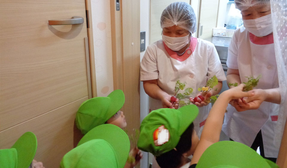 子どもたちが食べる給食は、園内の給食室で調理員が心を込めて作ります。乳幼児期は身体や味覚を育てる大事な時期です。食物本来の味を「おいしい」と感じるため、味付けはうす味で、かつお節や煮干し、昆布でだしをしっかりとって作ります。添加物や化学調味料を使わない為、身体にやさしい給食です。